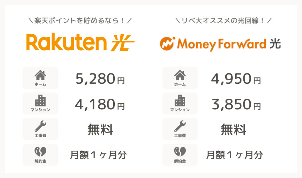 マネーフォワード光と楽天ひかりについて、下記の5項目で比較していきます。