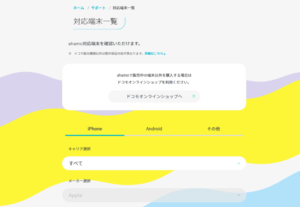ahamoの対応端末については、公式サイト内のコチラのページでチェックできます。